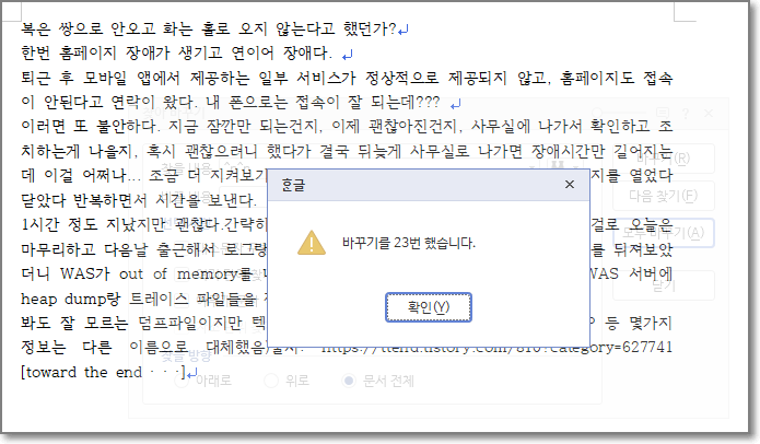바꾸기를 13번 했다는 메시지와 함께 엔터표시가 많이 줄어들어서 읽기에 적당한 편집상태로 변경되었다.