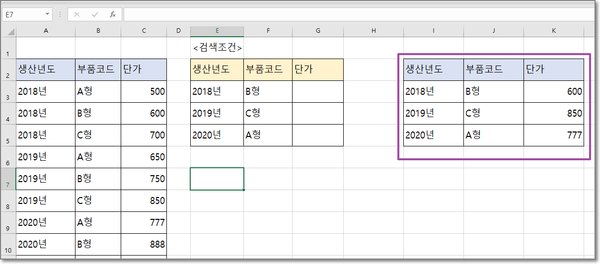 목록범위는 값을 찾고자 하는 A:C열이 되고 조건범위는 E:F열이 된다.