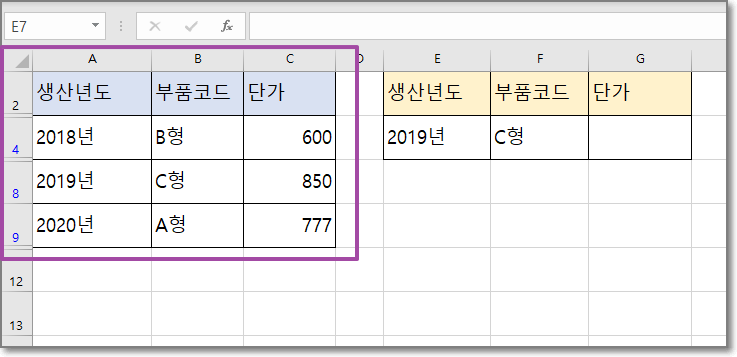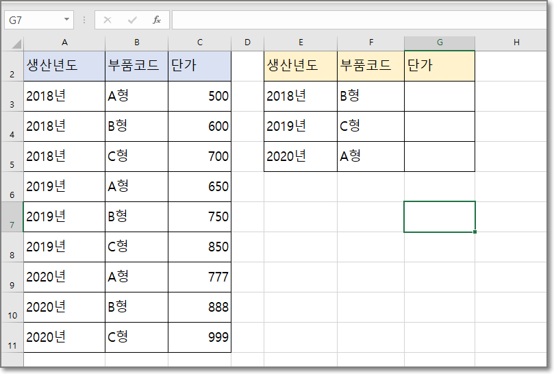 상황은 동일하게 유니크한 값 없이 생산년도와 부품코드 두 조건에 맞는 단가를 찾으려고 한다.