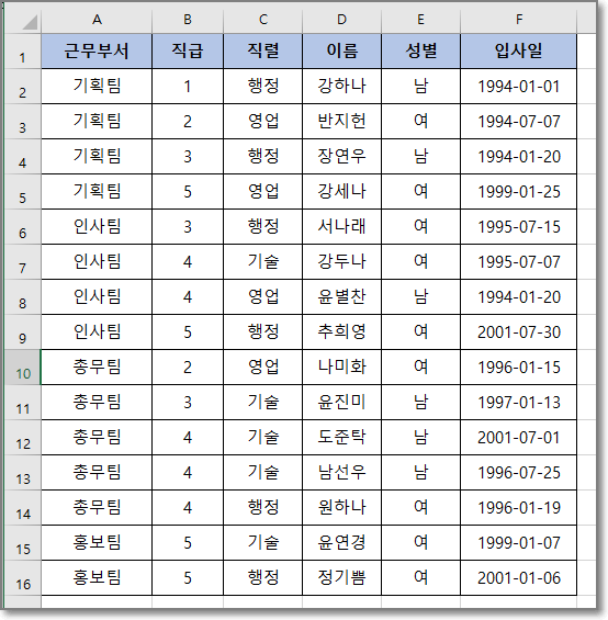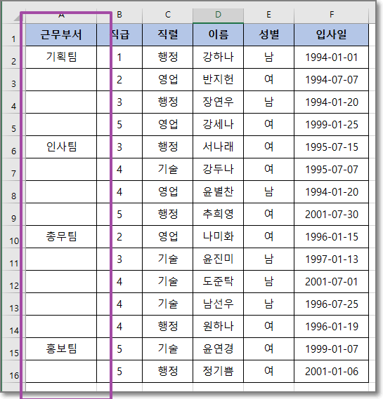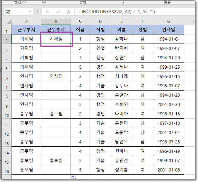 같은 부서일 경우 두번째 나오는 데이터부터 삭제해서 빈칸을 만들었다.