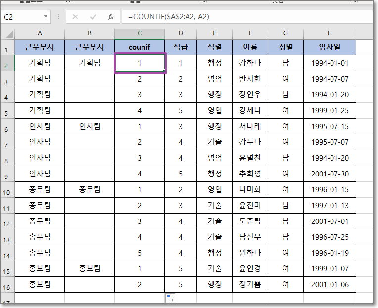 이렇게 만드는 방법은 임시 행을 만든 후 if와 countif함수를 사용한다.