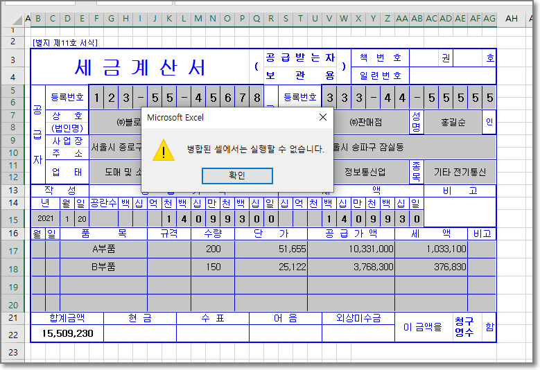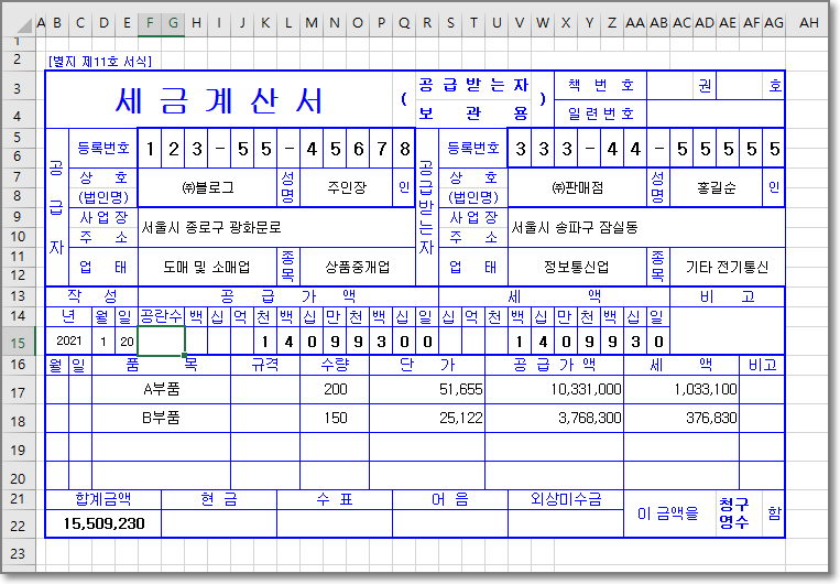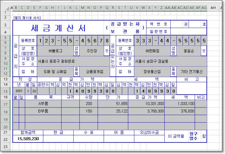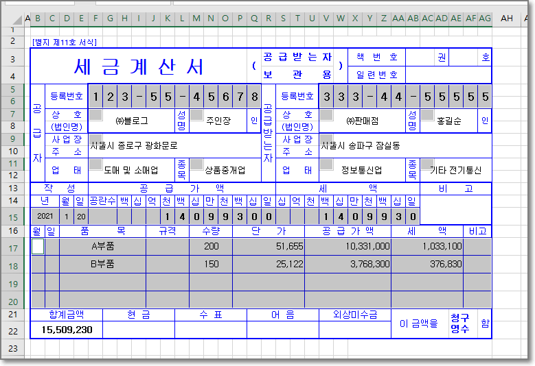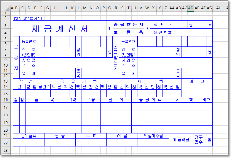 아래 그림같은 세금계산서를 예를들면 정해져있는 양식부분을 제외하고 필요한 데이터를 입력해서 출력하거나 따로 저장해서 사용하게 된다.