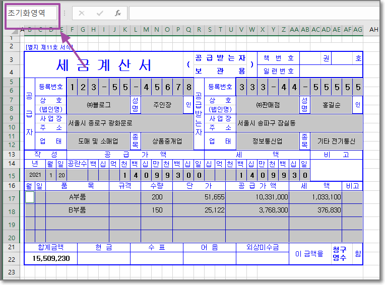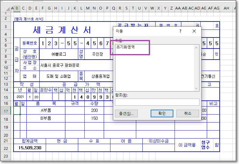 아까 이름정의 상자에 입력해서 정의한 [초기화영역]을 선택하고 확인 버튼을 클릭하면 아까 선택했던 부분들이 선택된 상태로 나타난다.