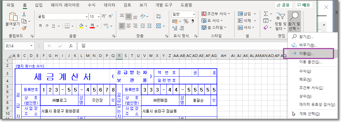 이제 초기화해야 할 필요가 있을 때 [홈 탭 - 찾기 및 선택 - 이동]을 클릭하거나 단축키 F5를 누른다.