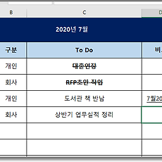 엑셀에서 글꼴모양(굵게, 밑줄, 기울임꼴, 취소선) 단축키로 변경하기 컴퓨터 문서작업을 할 때 단축키를 사용하는 것이 마우스를 이용하는 것보다 간단하고 편리한 경우가 많다. 엑셀에서 글자모양을 변경해주는 단축키를 알아본다. (마이크로소프트에서는 단축키라는 용어 대신 "바로가기 키"라는 말을 쓴다. 여기서는 그냥 "단축키"라고 하겠다) 엑셀은 수식작업 뿐 아니라 다른 용도(?)로도 많이 사용하는데 아래 그림같은 ToDo List를 사용한다면 단축키 사용이 유용할 수 있겠다 글자모양을 진하게(굵게), 밑줄, 기울임꼴(이탤릭체), 취소선(가운데줄)으로 변경시킬 수 있다. 이 중에서 굵게, 밑줄, 기울임꼴은 [홈 탭 - 글꼴]에 있는 아이콘으로도 변경할 수 있고 아래 그림처럼Ctrl + B, Ctrl + U, ..